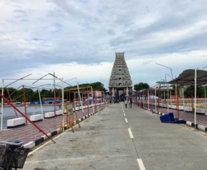 இறங்குதுறையில் இருந்து ஆலயத்திற்கு செல்லும் பாதையில் போடப்பட்டிருந்த கூடாரங்கள் காற்றினால் வீசப்பட்டிருப்பதுடன், ஆலயத்தின் முன்னால் உள்ள மண்டபங்களின் ஓடுகள் காற்றினால் துாக்கி வீசப்பட்டிருப்பதுடன், ஆலய வாசலில் அமைக்கப்பட்டுள்ள சிறு கடைகளும் காற்றினால் துாக்கி வீசப்பட்டுள்ளது.
