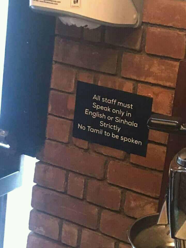 அங்கு பணியாற்றுபவர்கள் ஆங்கிலம், சிங்களம் மட்டுமே அங்கே கதைக்க முடியுமென அறிவித்தல் ஒட்டப்பட்டுள்ளது.