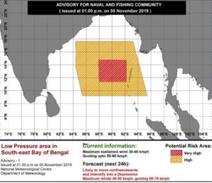 இதேவேளை கிழக்கு- மத்திய மற்றும் அண்மையாகவுள்ள தென்கிழக்கு வங்காள விரிகுடா கடற்பரப்பிலும் அந்தமான் கடற்பரப்பிலும் உருவாகிய குறைந்த அழுத்தப் பிரதேச நிலைஒரு தாழமுக்கமாகவிருத்தியடைந்துவட அகலாங்கு 13.3N இற்கும் கிழக்கு நெடுங்கோடு 88.9E இற்கும் அருகில்மையம் கொண்டுள்ளது.