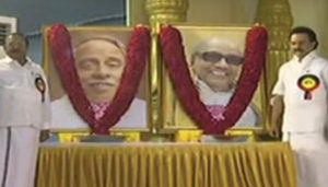 பொதுக்குழு மேடையில் வைக்கப்பட்டிருந்த அண்ணா, கருணாநிதி படங்களுக்கு மு.க.ஸ்டாலின் மலர்தூவி மரியாதை செலுத்தினார்.