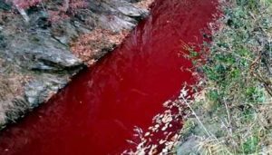 தென்கொரியாவில் பன்றிகளின் உடல்கள் புதைக்கப்பட்ட பகுதிகளில் மழை நீரில் மணல் கரைந்து, பன்றிகளின் ரத்தம் வழிந்தோடி இம்ஜின் ஆற்றில் கலந்து ஆறு முழுவதும் சிவப்பாக மாறியுள்ளது.ஆசிய நாடுகளில் கடந்த சில வாரங்களுக்கு முன்பு ஆப்பிரிக்க பன்றி காய்ச்சல் வேகமாக பரவியது. ஆப்பிரிக்க பன்றிக்காய்ச்சல் விலங்குகளிடம் வேகமாக பரவக்கூடிய, குணப்படுத்த முடியாத நோயாaகும். இந்த நோய் தாக்கிய பன்றிகளில் எதுவும் உயிர் தப்புவதில்லை. ஆனால், இந்த நோய் மனிதர்களுக்கு ஆபத்தானது இல்லை.