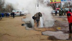 இந்த நிலையில் நேற்று முன்தினம் பென்ஷா நகரில் உள்ள ஒரு சாலையில் 2 ஆண்களுடன் கார் ஒன்று சென்று கொண்டிருந்தது. அப்போது திடீரென சாலையில் பெரிய பள்ளம் ஏற்பட்டது. இதில் அந்த கார் பள்ளத்துக்குள் விழுந்தது. விழுந்த வேகத்தில் கார் சாலைக்கு அடியில் உள்ள வெந்நீர் குழாயை உடைத்து கொண்டு உள்ளே பாய்ந்தது. இதில் காருக்குள் இருந்த 2 பேரும் உடல் வெந்து, சம்பவ இடத்திலேயே பலியாகினர்.