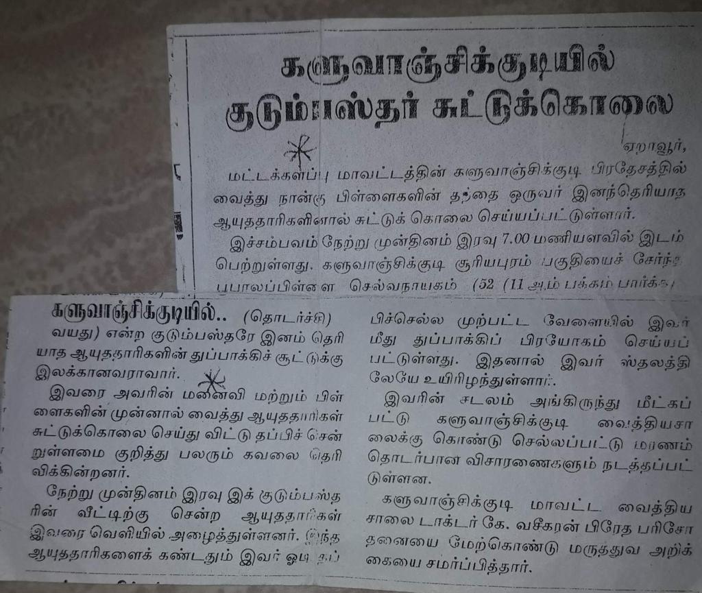 செல்வம் மாமா சுடப்பட்டடது தொடர்பான செய்தித்துண்டு.