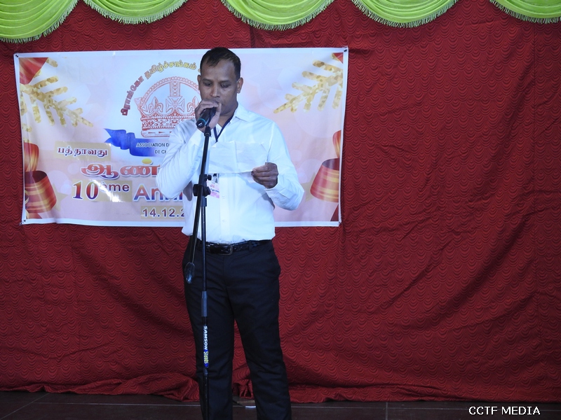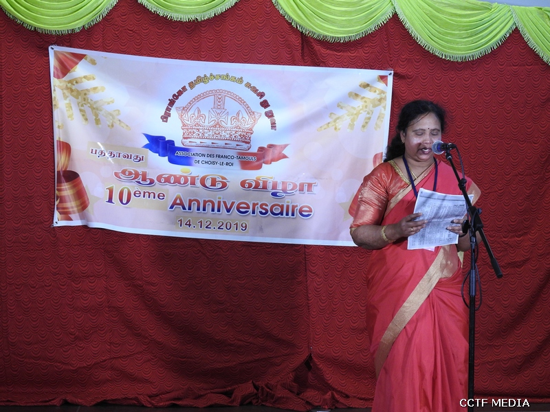 பிரான்சு சுவாசி லு றூவா தமிழ்ச்சங்கம் – தமிழ்ச்சோலைப் பள்ளியின் 10 ஆவது ஆண்டு நிறைவு விழா கடந்த 14.12.2019 சனிக்கிழமை இடம்பெற்றது. மங்கல விளக்கேற்றலைத் தொடர்ந்து அகவணக்கம் இடம்பெற்றது.