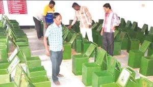 பின்னர் வாக்குப்பதிவு நாளின்போது வாக்குச்சாவடிகளில் பயன்படுத்தக்கூடிய பேனா, பென்சில், மை பாட்டில், குண்டூசி, தீப்பெட்டி, மெழுகு, சிறிய கத்தி, பசை உள்ளிட்ட பொருட்கள் தாந்தோன்றி ஒன்றிய அலுவலகத்தில் தயார் நிலையில் வைக்கப்பட்டிருந்தன. வாக்கு செலுத்தப்படக்கூடிய இடத்தினை மறைமுகமாக வைக்க பயன்படும் அட்டைகள் போன்றவையும் அங்குள்ள அறையில் அடுக்கி வைக்கப்பட்டிருந்தன. தாந்தோணியில் 397 வாக்குப்பெட்டிகள் இருப்பு உள்ளது. அந்த வகையில் வாக்குப்பெட்டிகள் மற்றும் வாக்குப்பதிவுக்கான பொருட்களை பிரித்து வாக்குச்சாவடிகளுக்கு அனுப்பும் வகையில் ஏற்பாடுகள் தீவிரமாக மேற்கொள்ளப்பட்டு வருகிறது.