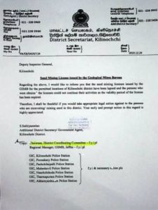 இதனையடுத்து கிளிநொச்சி மாவட்டச் செயலகம் மணல் அகழ்வதற்கான அனுமதி பத்திரங்கள் இரத்துச் செய்யப்பட்டுள்ள விடயத்தை கடிதம் மூலம் பிரதி காவல் அதிபருக்கு அறிவித்துள்ளதோடு, கிளிநொச்சி மாவட்டத்தில் உள்ள அனைத்து காவல் நிலையங்களின் பொறுப்பதிகாரிகளுக்கும் பிரதியிட்டுள்ளனர்.