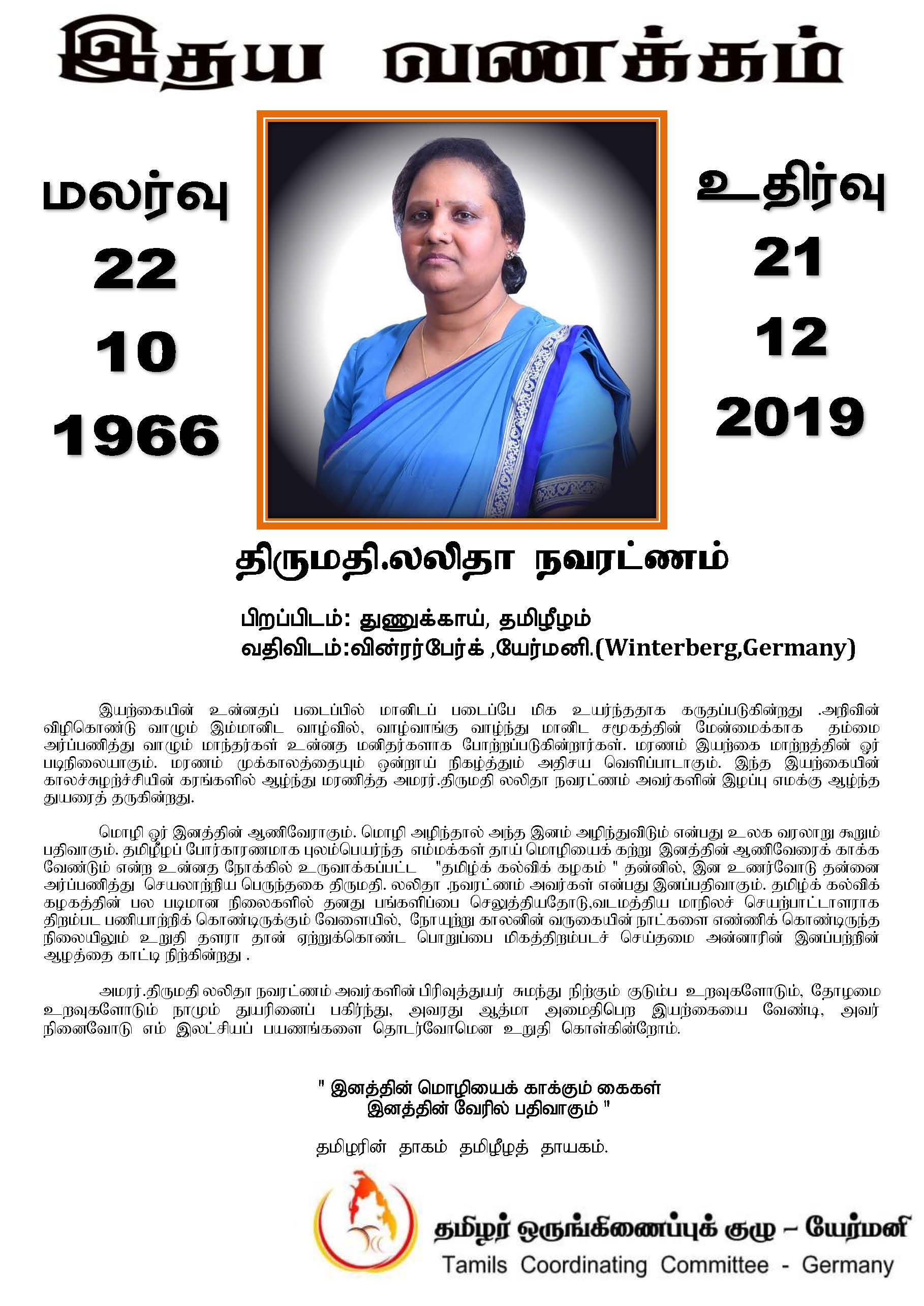 அமரர்.திருமதி லலிதா நவரட்ணம் அவர்களின்; பிரிவுத்துயர் சுமந்து நிற்கும் குடும்ப உறவுகளோடும், தோழமை உறவுகளோடும் நாமும் துயரினைப் பகிர்ந்து, அவரது ஆத்மா அமைதிபெற இயற்கையை வேண்டி, அவர் நினைவோடு எம் இலட்சியப் பயணங்களை தொடர்வோமென உறுதி கொள்கின்றோம்.