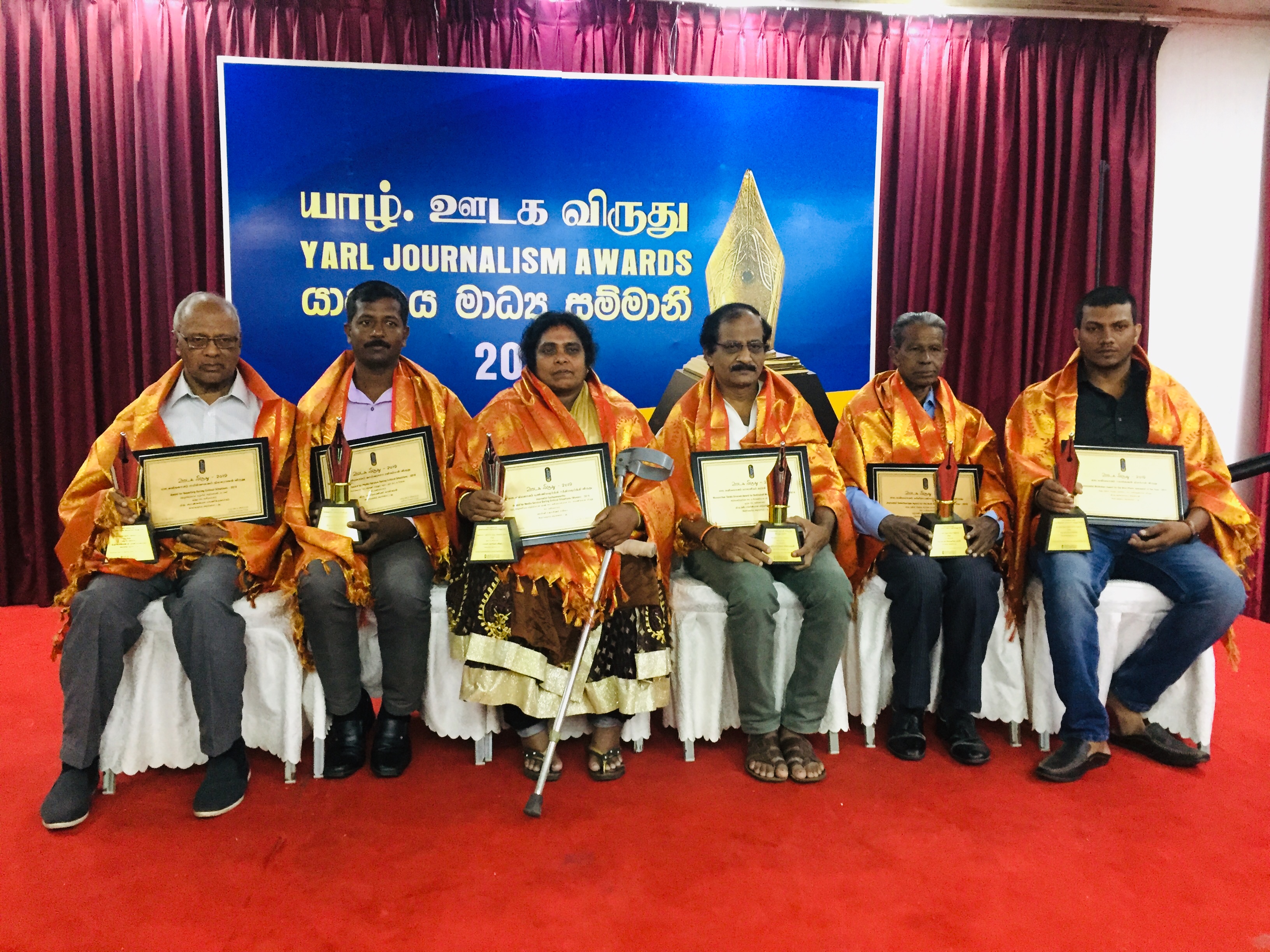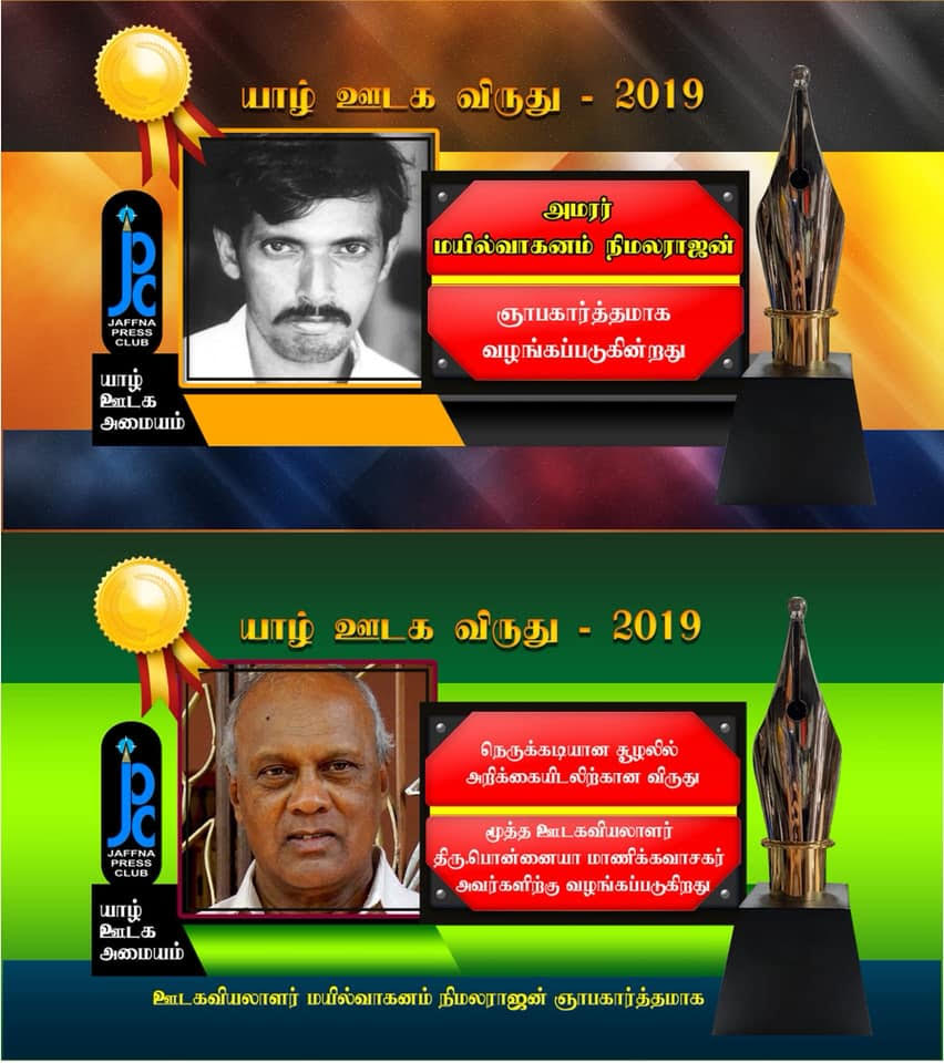 யாழ் ஊடக அமையத்தின் ஏற்பாட்டில் நடாத்தபட்ட ‘யாழ் ஊடக விருது 2019′ வழங்கும் நிகழ்வில் ஏழு பிரிவுகளின் கீழ் ஏழு ஊடகவியலாளர்களுக்கு விருது வழங்கி கௌரவிக்கும் நிகழ்வு இன்று மாலை யாழ்ப்பாணத்தில் சிறப்புடன் நடைபெற்றுள்ளது.’அமரர் மயில்வாகனம் நிமலராஜன்’ ஞாபகார்த்த விருது – மூத்த ஊடகவியலாளர் பொன்னையா மாணிக்கவாசகர்.அமரர் மயில்வாகனம் நிமலராஜன் ஞாபகர்த்தமாக, நெருக்கடியான சூழலில் அறிக்கையிடல் பணிக்கான விருது மூத்த ஊடகவியலாளர் பொன்னையா மாணிக்கவாசகர் அவர்களுக்கு வழங்கி கௌரவிக்கப்பட்டுள்ளது.