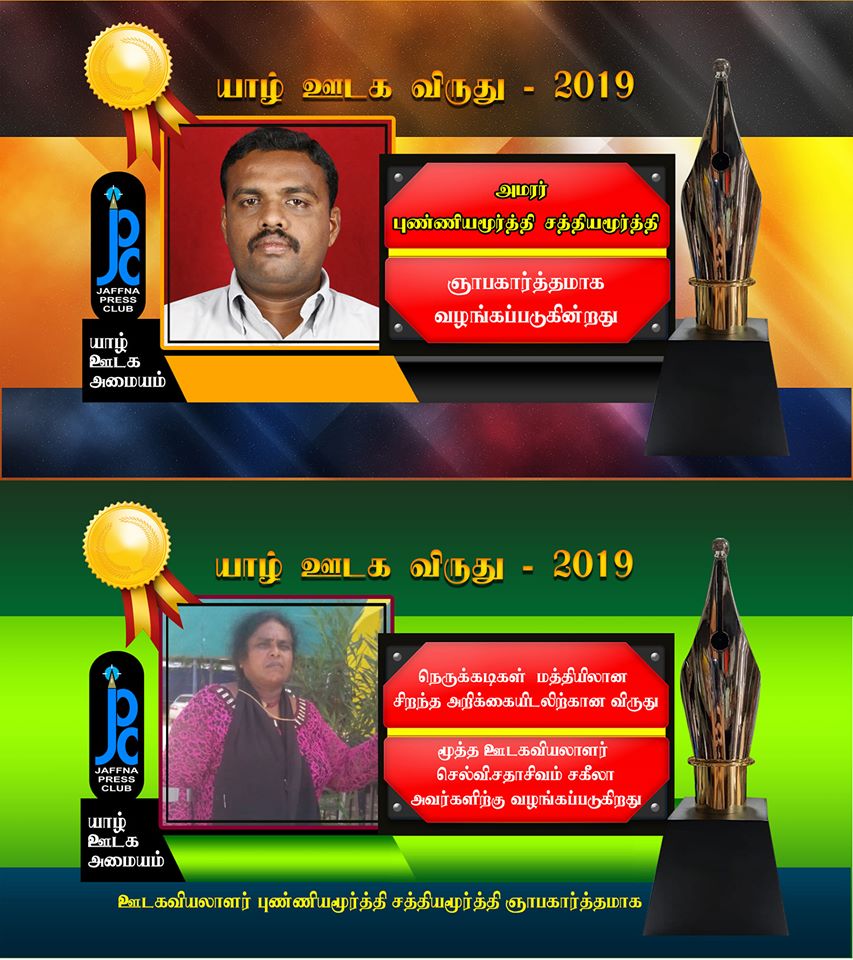 ‘அமரர் புண்ணியமூர்த்தி சத்தியமூர்த்தி’ ஞாபகார்த்த விருது – ஊடகவியலாளர் செல்வி. சதாசிவம் சகீலா.அமரர் புண்ணியமூர்த்தி சத்தியமூர்த்தி ஞாபகார்த்தமாக, நெருக்கடிகளிற்கு மத்தியிலான பெண் ஊடகவியலாளராக ஊடகப்பணிக்கான விருது ஊடகவியலாளர் செல்வி.சதாசிவம் சகீலா (முல்லைதீவு) அவர்களுக்கு வழங்கி கௌரவிக்கப்பட்டுள்ளது.’அமரர் சகாதேவன் நிலக்சன்’ ஞாபகார்த்த விருது – ஊடகவியலாளர் தர்மபாலா திலக்சன்.அமரர் சகாதேவன் நிலக்சன் ஞாபகார்த்தமாக, வருடத்தின் சிறந்த செய்தி புகைப்படத்துக்கான விருது நெருக்கடிகள் மத்தியிலான பணியாற்றிய தர்மபாலா திலக்சன் அவர்களுக்கு வழங்கி கௌரவிக்கப்பட்டுள்ளது.
