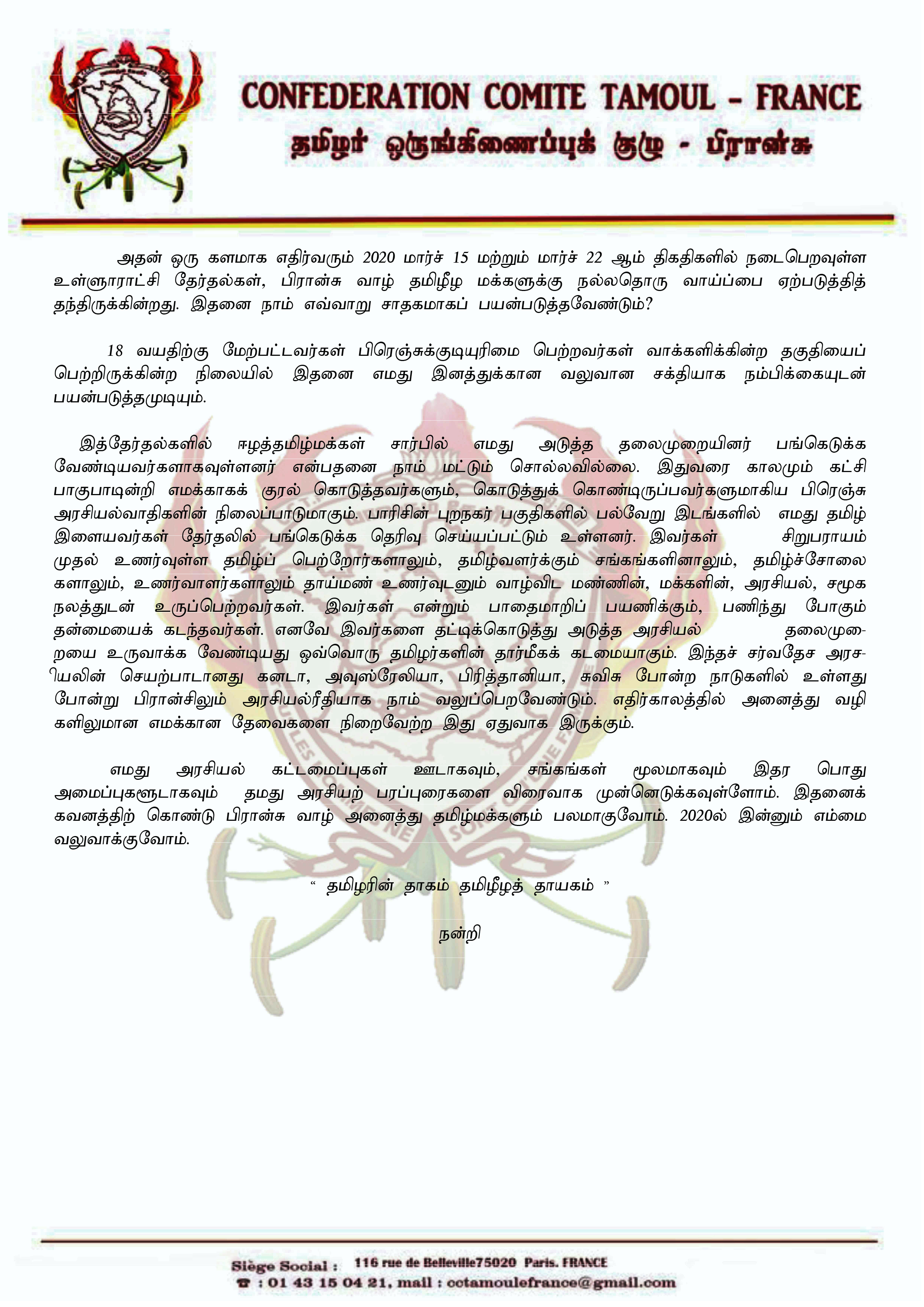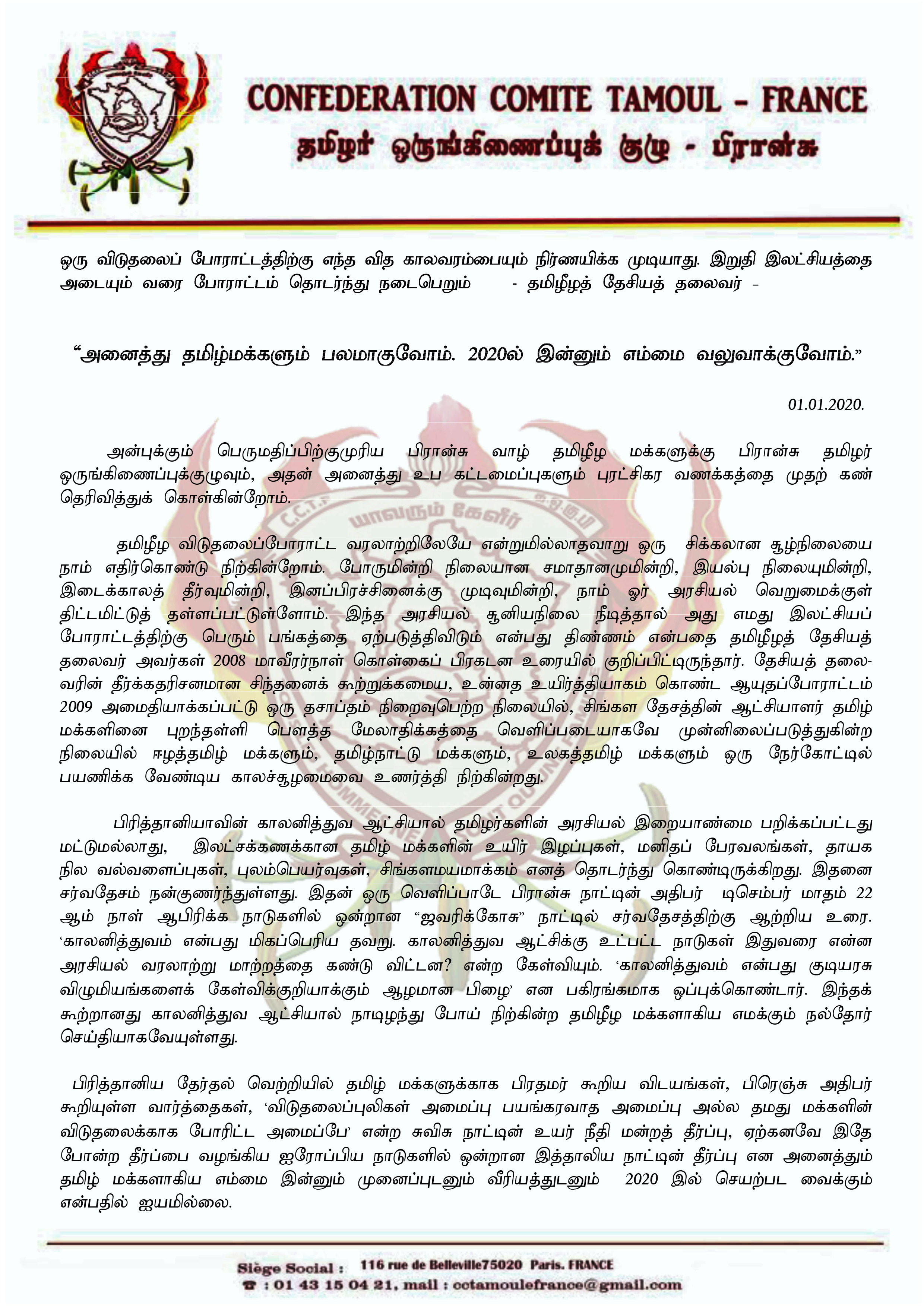 எமது அரசியல் கட்டமைப்புகள் ஊடாகவும், சங்கங்கள் மூலமாகவும் இதர பொது அமைப்புகளூடாகவும் தமது அரசியற் பரப்புரைகளை விரைவாக முன்னெடுக்கவுள்ளோம். இதனைக் கவனத்திற் கொண்டு பிரான்சு வாழ் அனைத்து தமிழ்மக்களும் பலமாகுவோம். 2020ல் இன்னும் எம்மை வலுவாக்குவோம்.