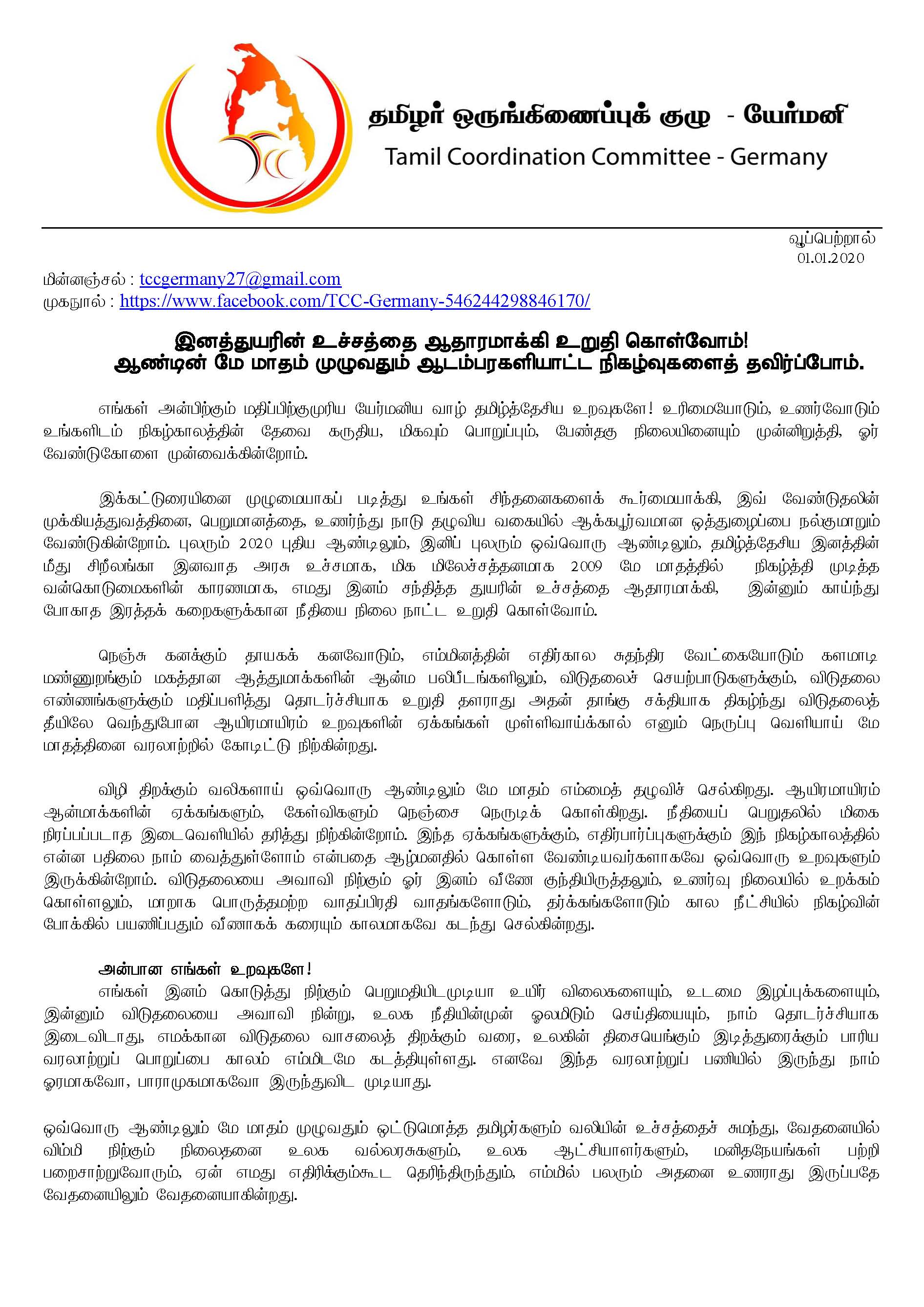 இக்கட்டுரையினை முழுமையாகப் படித்து உங்கள் சிந்தனைகளைக் கூர்மையாக்கி, இவ் வேண்டுதலின் முக்கியத்துவத்தினை, பெறுமானத்தை, உணர்ந்து நாடு தழுவிய வகையில் ஆக்கபூர்வமான ஒத்துழைப்பை நல்குமாறும் வேண்டுகின்றோம். புலரும் 2020 புதிய ஆண்டிலும், இனிப் புலரும் ஒவ்வொரு ஆண்டிலும், தமிழ்த்தேசிய இனத்தின் மீது சிறீலங்கா இனவாத அரசு உச்சமாக, மிக மிலேச்சத்தனமாக 2009 மே மாதத்தில் நிகழ்த்தி முடித்த வன்கொடுமைகளின் காரணமாக, எமது இனம் சந்தித்த துயரின் உச்சத்தை ஆதாரமாக்கி, இன்னும் காய்ந்து போகாத இரத்தக் கறைகளுக்கான நீதியை நிலை நாட்ட உறுதி கொள்வோம்.