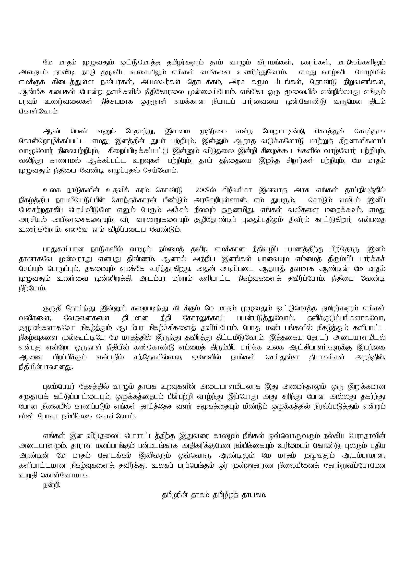 மே மாதம் முழுவதும் ஒட்டுமொத்த தமிழர்களும் தாம் வாழும் கிராமங்கள், நகரங்கள், மாநிலங்களிலும் அதையும் தாண்டி நாடு தழுவிய வகையிலும் எங்கள் வலிகளை உணர்த்துவோம். எமது வாழ்விட மொழியில் எமக்குக் கிடைத்துள்ள நண்பர்கள், அயலவர்கள் தொடக்கம், அரச கரும பீடங்கள், தொண்டு நிறுவனங்கள், ஆன்மீக சபைகள் போன்ற தளங்களில் நீதிகோரலை முன்வைப்போம். எங்கோ ஒரு மூலையில் என்றில்லாது எங்கும் பரவும் உணர்வலைகள் நிச்சயமாக ஒருநாள் எமக்கான நியாயப் பார்வையை முன்கொண்டு வருமென திடம் கொள்வோம்.