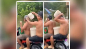 பின்னால் இருந்த நபர், வாளியில் இருந்து தண்ணீரை தன் மீது ஊற்றிக்கொண்டும், மோட்டார் சைக்கிளை ஓட்டியவர் மீது ஊற்றிக்கொண்டும் சென்றார். அவர்கள் தங்களுக்கு தாங்களே சோப்பும் போட்டுக் கொண்டனர்.