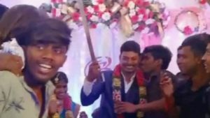 அப்போது மேடையில் நின்றிருந்த கும்பலில் இருந்த ஒருவர் 4 அடி நீள பட்டாக்கத்தி ஒன்றைக் கையில் வைத்திருந்தார். அவர் கத்தியை உயர்த்திப் பிடித்து நாக்கைத் துருத்தி வீடியோவுக்கு போஸ் கொடுத்தார். பின்னர் கத்தியுடன் நடனம் ஆடினார். மாப்பிள்ளையும் கத்தியை உயர்த்தி போஸ் கொடுத்தார். இதை செல்போனில் பதிவு செய்த நபர் ஒருவர், வாட்ஸ் அப்பில் ஷேர் செய்துவிட்டார். அது மணமகனுக்கே வினையாகப் போனது.