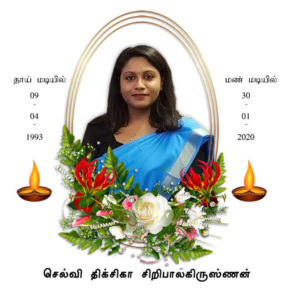 எமது பிரித்தானிய தமிழ் இளையோர் அமைப்பின் பொறுப்பாளர் செல்வி திக்சிகா சிறிபாலகிருஸ்ணன் அவர்களின் திடீர் மறைவுச் செய்தி கேட்டு நாங்கள் ஆறாத்துயரம் அடைந்துள்ளோம்.