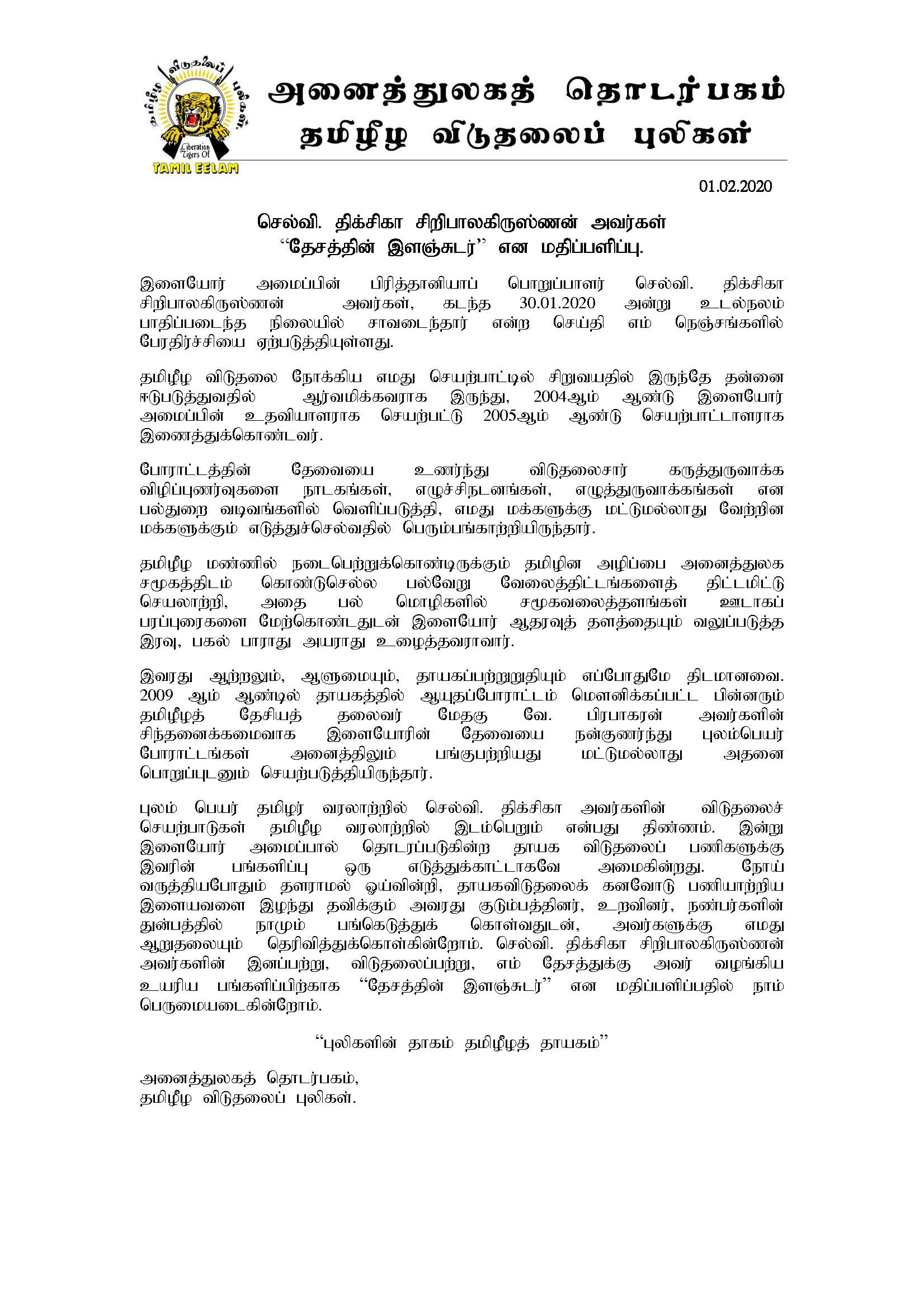 இளையோர் அமைப்பின் பிரித்தானியாப் பொறுப்பாளர் செல்வி. திக்சிகா சிறிபாலகிருஸ்ணன் அவர்கள் கடந்த 30.01.2020 அன்று உடல்நலம் பாதிப்படைநநிலையில் சாவடைந்தார் என்ற செய்தி எம் நெஞ்சங்களில் பேரதிர்ச்சியை ஏற்படுத்தியுள்ளது.