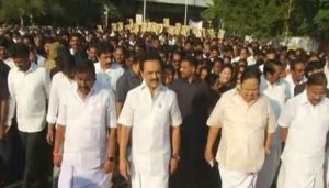 இதனை முன்னிட்டு தி.மு.க. தலைவர் மு.க.ஸ்டாலின் தலைமையில் அமைதிப்பேரணி இன்று நடைபெற்று வருகிறது.