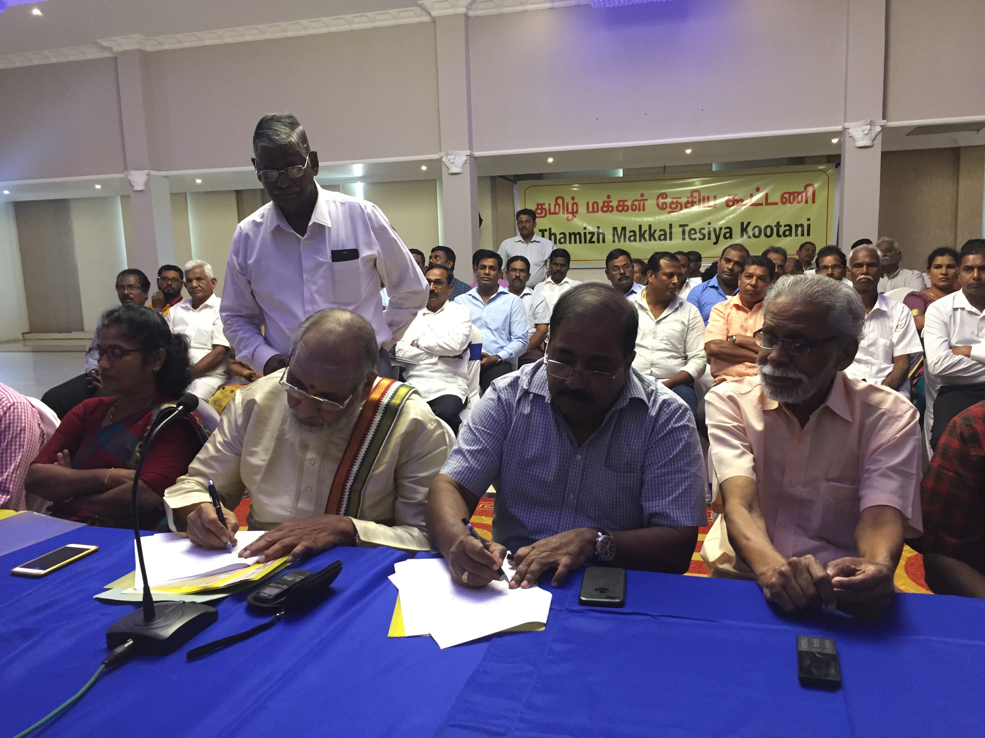 வடக்கு மாகாண முன்னாள் முதலமைச்சர் சீ.வீ.விக்கினேஸ்வரன் தலைமையில் உருவாகும் புதிய கூட்டணியான “தமிழ் மக்கள் தேசிய கூட்டணி”புரிந்துணர்வு ஒப்பந்தம் இன்று ஞாயிற்றுக்கிழமை ரில்கோ விருந்தினர் விடுதியில் கைச்சாத்திடப்பட்டது.