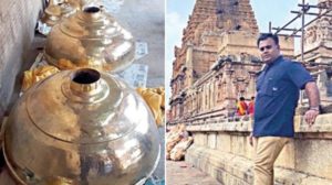 தஞ்சை பெரிய கோயில் கலசத்துக்கு தங்க முலாம் பூசும் திருப்பணிக்காக கோவையைச் சேர்ந்த தொழில்முனைவர் குமார், தனது வீட்டையே அடமானம் வைத்துள்ளார்.
