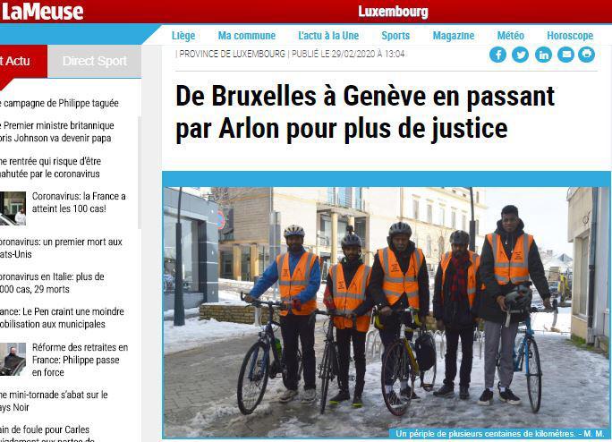 வரும் வழியில் நேற்றைய தினம் (28.02.2020) அரசியற் சந்திப்புக்களையும் La meuse Liège, La Meuse Luxembourg ஊடகச் சந்திப்புக்களையும் மேற்கொண்டு . இன்றைய தினம் (29.02.2020) Germany நாட்டின் எல்லையினை வந்தடைந்தது, தொடந்து Remich ஊடாக Saarbrücken மாநகரசபை அரசியற் சந்திப்பினை நோக்கி விரைகின்றது. எவ்விடர் வரினும் தொடர்ந்தும் திட்டமிட்டபடி France நாட்டினை ஊடறுத்து Swiss , Geneva மாநகரில் அமைந்துள்ள ஐ.நா முன்றலில் (ஈகைப்பேரொளி முருகதாசன் திடலினை) வந்தடையும் என்பது திண்ணம்.