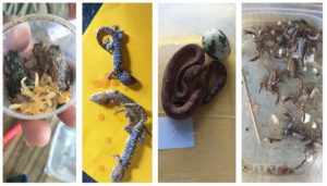 இலங்கையில் அழிவடையும் ஆபத்தை எதிர்கொண்டுள்ள ஓணான்கள், தேள்கள், தவளைகள், பள்ளிகள், நத்தைகள், சிலந்திகள், பாம்புகள் உட்பட 550 உயிரினங்களை பிரத்தியேகமாக தயாரிக்கப்பட்டிருந்த பெட்டிகளில் அடைத்து அவர்கள் கொண்டு செல்ல நடவடிக்கை எடுக்கையிலேயே வனத்துறை அதிகாரிகளால் கைது செய்யப்பட்டனர்.