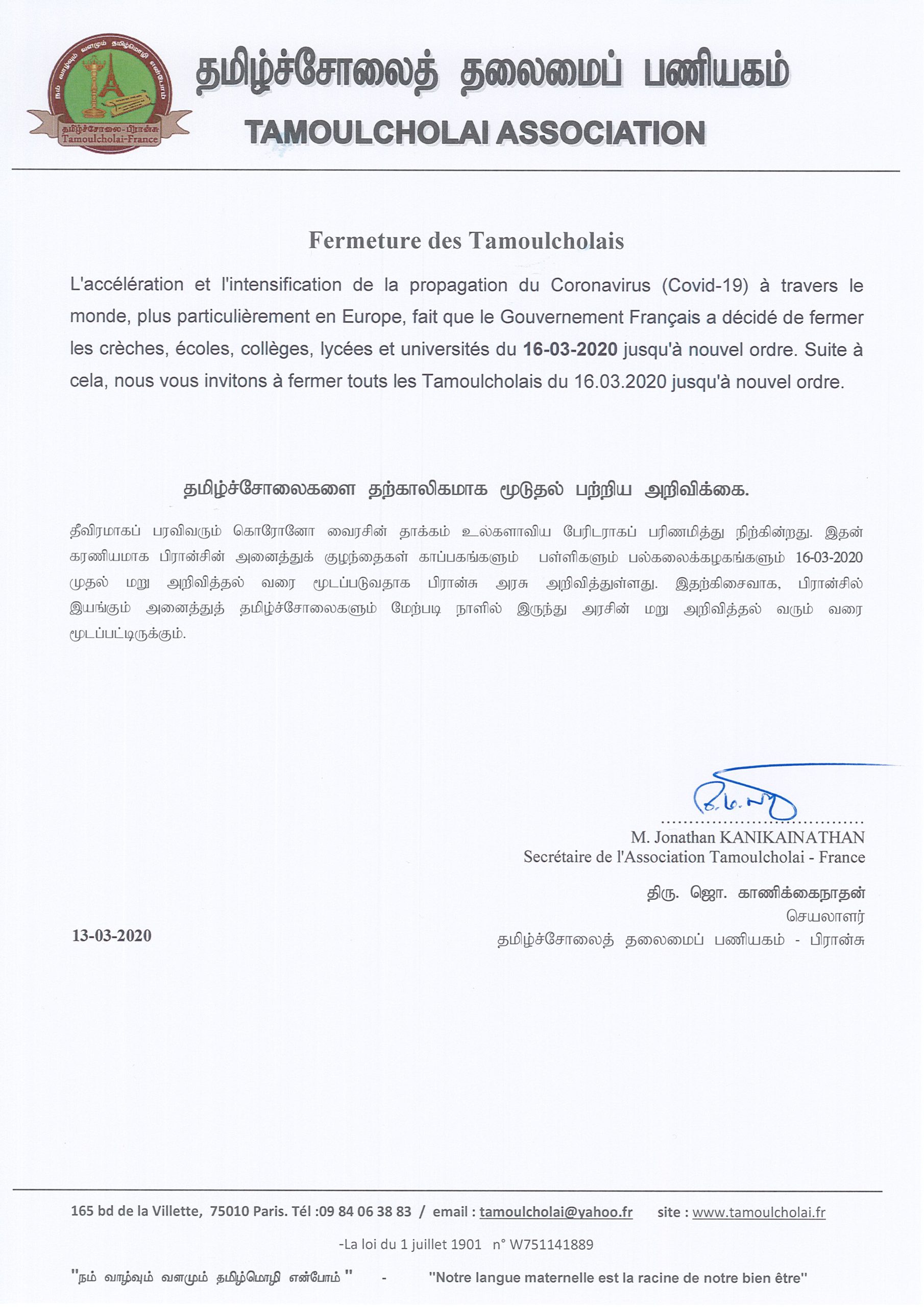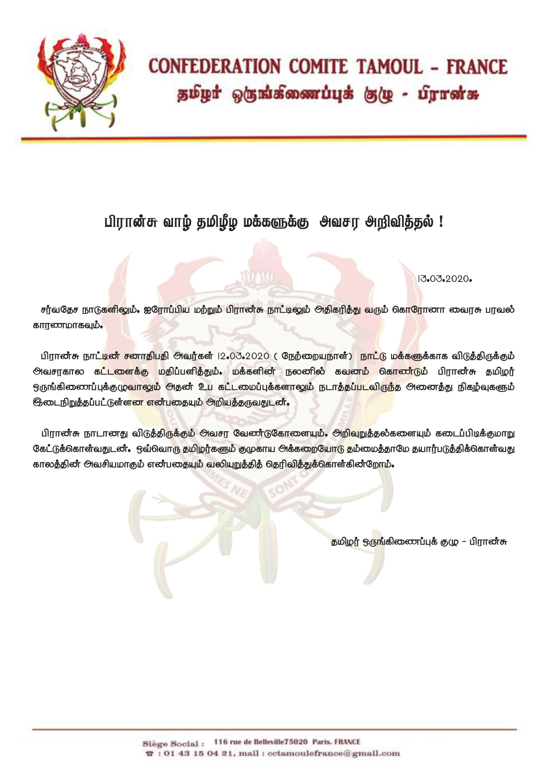 புலம்பெயர் தேசங்களில் பிரான்சு வாழ் தமிழீழ மக்களுக்கு தமிழர் ஒருங்கிணைப்புக் குழு விடுக்கும் அவசர அறிவித்தல்! Posted on March 14, 2020 at March 14, 2020 by கரிகாலன் 507 0