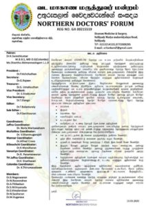 தேவையற்ற பயங்களைக் களைந்து தொற்று பரவுதலைத் தடுக்கும் நடவடிக்கைகளை சரிவரப் பின்பற்றி இந்த கொரோனா வைரஸ் தொற்று சவாலை எதிர்கொள்ள அனைவரது பங்களிப்பினையும் வழங்க வேண்டும் என வடமாகாண மருத்துவர் மன்றம் சார்பாக கேட்டுக்கொள்கிறேன்.