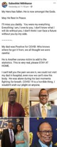 லண்டனில் #Covid19 தாக்கத்திற்குப் பலியான இலங்கைத் தமிழர் அமரர் குகபிரசாத் அவர்களின் மகளின் பதிவின் தமிழாக்கம் இது…