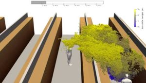 சூப்பர் மார்க்கெட்டுகளில் உள்ள அலமாரிகளுக்கு இடையில் ஒரு நபர் இருமுவதுபோன்ற காட்சியை மையமாக வைத்து ஆராய்ச்சியாளர்கள் 3டி வீடியோவை உருவாக்கி உள்ளனர். இருமிய நபரை சுற்றி காற்றுத்துகள்கள் பரவி மேகம் போன்று திரள்வதைவும், பின்னர் அது கொஞ்சம் கொஞ்சமாக சிதறி மறைவதையும் அந்த வீடியோ மூலம் விளக்கி உள்ளனர். ஆனால் இவ்வாறு நடைபெறுவதற்கு பல நிமிடங்கள் வரை ஆகலாம் என கூறுகின்றனர்.