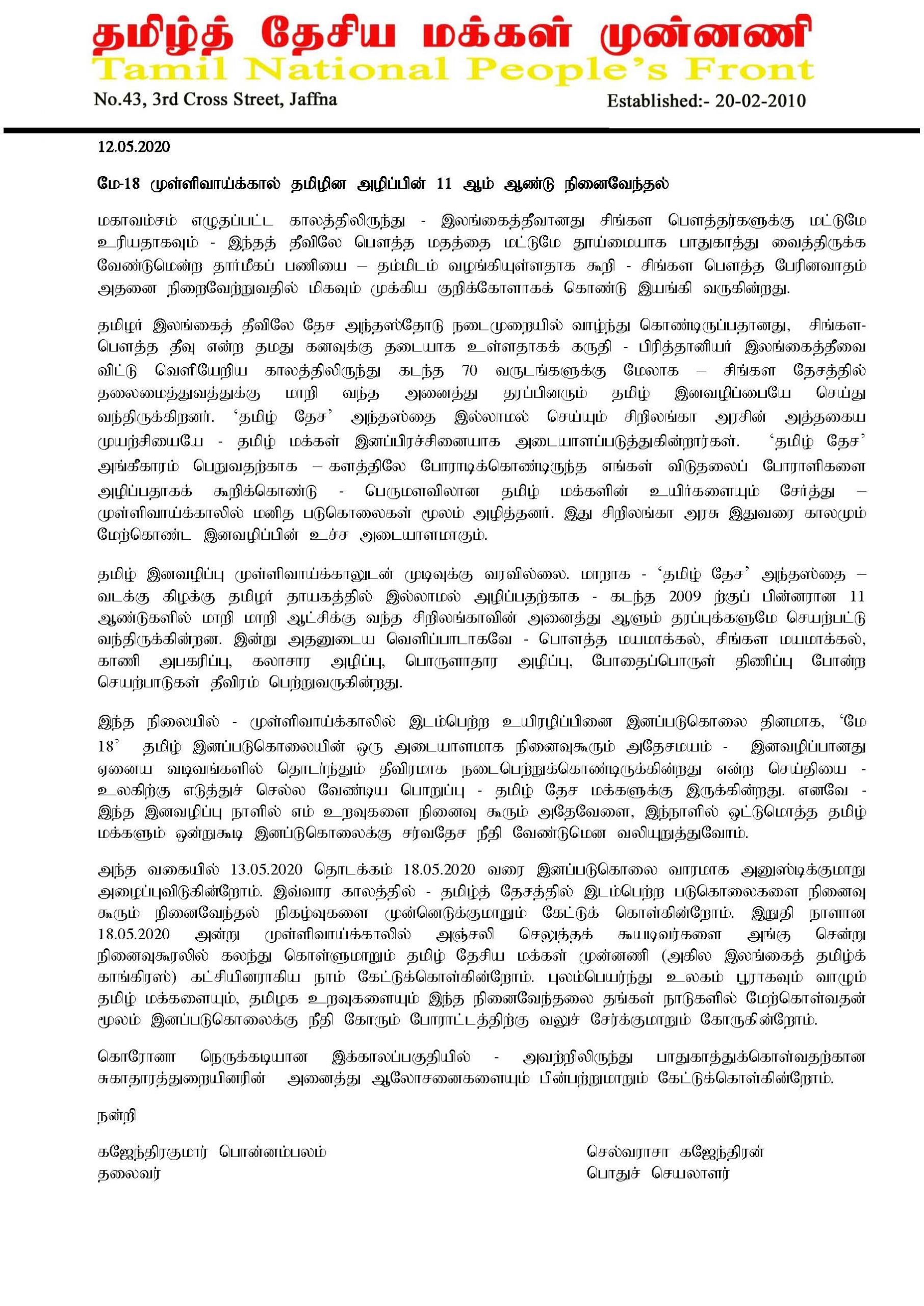 இந்த நிலையில் – முள்ளிவாய்க்காலில் இடம்பெற்ற உயிரழிப்பினை இனப்படுகொலை தினமாக, ‘மே 18’ தமிழ் இனப்படுகொலையின் ஒரு அடையாளமாக நினைவுகூரும் அதேசமயம் – இனவழிப்பானது ஏனைய வடிவங்களில் தொடர்ந்தும் தீவிரமாக நடைபெற்றுக்கொண்டிருக்கின்றது என்ற செய்தியை – உலகிற்கு எடுத்துச் செல்ல வேண்டிய பொறுப்பு – தமிழ் தேச மக்களுக்கு இருக்கின்றது. எனவே – இந்த இனவழிப்பு நாளில் எம் உறவுகளை நினைவு கூரும் அதேவேளை, இந்நாளில் ஒட்டுமொத்த தமிழ் மக்களும் ஒன்றுகூடி இனப்டுகொலைக்கு சர்வதேச நீதி வேண்டுமென வலியுறுத்துவோம்