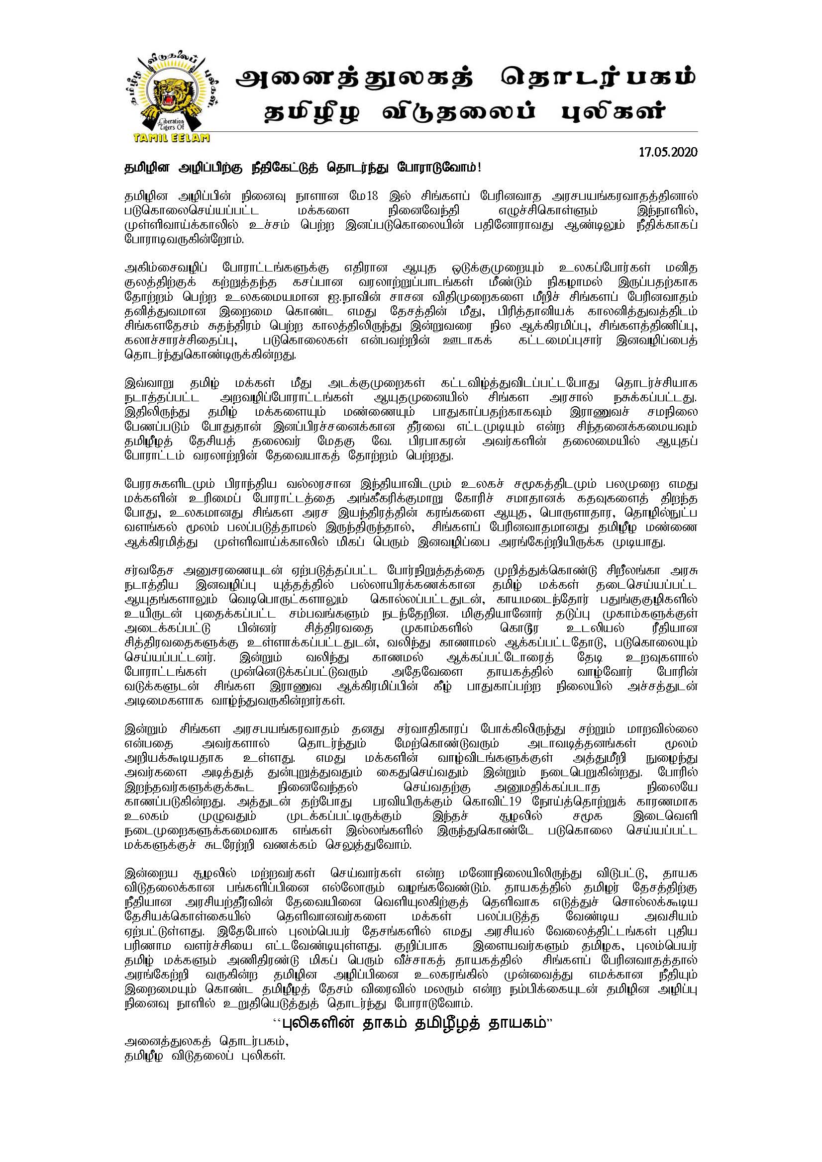 தமிழின அழிப்பின் நினைவு நாளான மே18 இல் சிங்களப் பேரினவாத அரசபயங்கரவாதத்தினால் படுகொலைசெய்யப்பட்ட மக்களை நினைவேந்தி எழுச்சிகொள்ளும் இந்நாளில், முள்ளிவாய்க்காலில் உச்சம் பெற்ற இனப்படுகொலையின் பதினோராவது ஆண்டிலும் நீதிக்காகப் போராடிவருகின்றோம்.