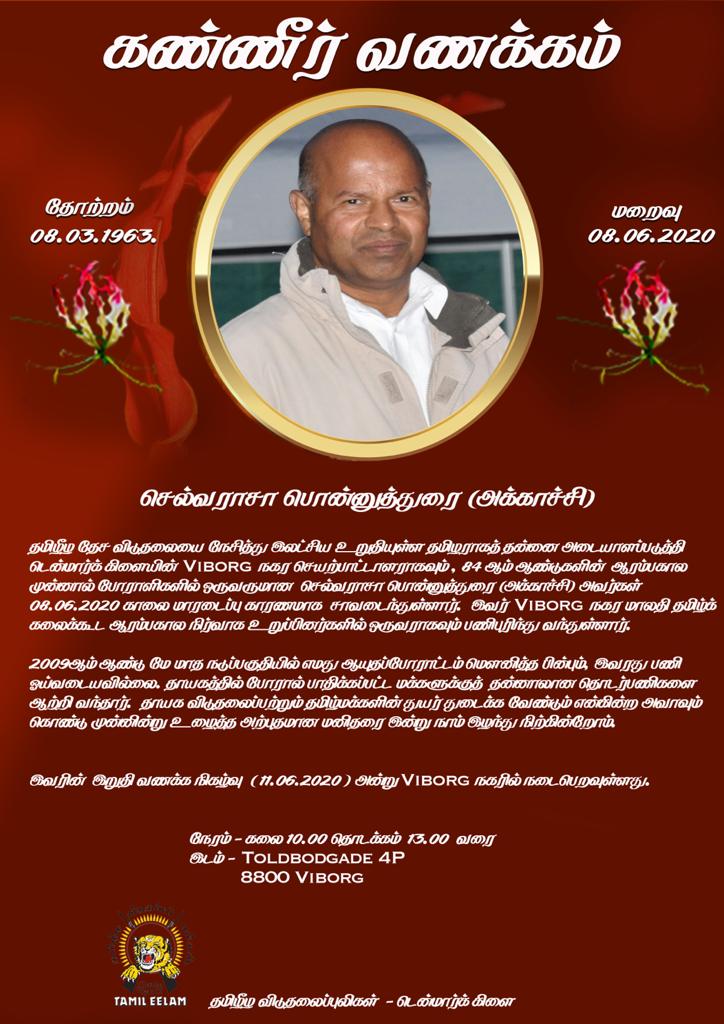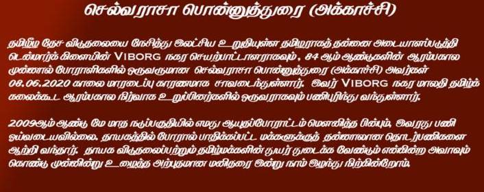 புலம்பெயர் தேசங்களில் முக்கிய செய்திகள் டென்மார்க் கிளையின் தமிழ்த் தேசியச் செயற்பாட்டாளர் செல்வராசா பொன்னுத்துரை(அக்காச்சி) சாவடைந்துள்ளார். Posted on June 9, 2020 at June 9, 2020 by கரிகாலன் 690 0