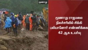 மூணாறு ராஜமலை நிலச்சரிவில் சிக்கி உயிரிழந்தோர் எண்ணிக்கை 42 ஆக அதிகரித்துள்ளது.கேரள மாநிலத்தில் கடந்த சில தினங்களாக கனமழை பெய்து வருகிறது. இதனால் வெள்ளம் மற்றும் நிலச்சரிவுகள் ஏற்பட்டுள்ளன.