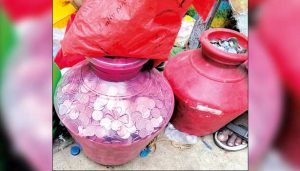 அவர்களது வீட்டுக்குள் குப்பைகள் குவியல் குவியலாக மூட்டை கட்டப்பட்டு இருந்தன. அவற்றை போலீசார் சுத்தம் செய்தனர். அப்போது அந்த வீட்டில் ஆங்காங்கே பணம் சிதறிய நிலையிலும், பிளாஸ்டிக் குடங்கள், பிளாஸ்டிக் பைகளில் சில்லரைகள் குவிந்து கிடப்பதை கண்டு போலீசார் அதிர்ச்சி அடைந்தனர்.