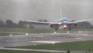 பிரிட்டனில் உள்ள பிரிஸ்டல் விமான நிலையத்திற்கு சமீபத்தில் போயிங் ரக விமானம் ஒன்று வந்தது. விமான நிலையத்தில் தரையிறங்கும்போது பலத்த காற்று வீசியது. காற்றின் வேகத்தை சமாளித்து விமானத்தை ஓடுபாதையில் நேராக தரையிறக்குவதில் சிக்கல் ஏற்பட்டது.