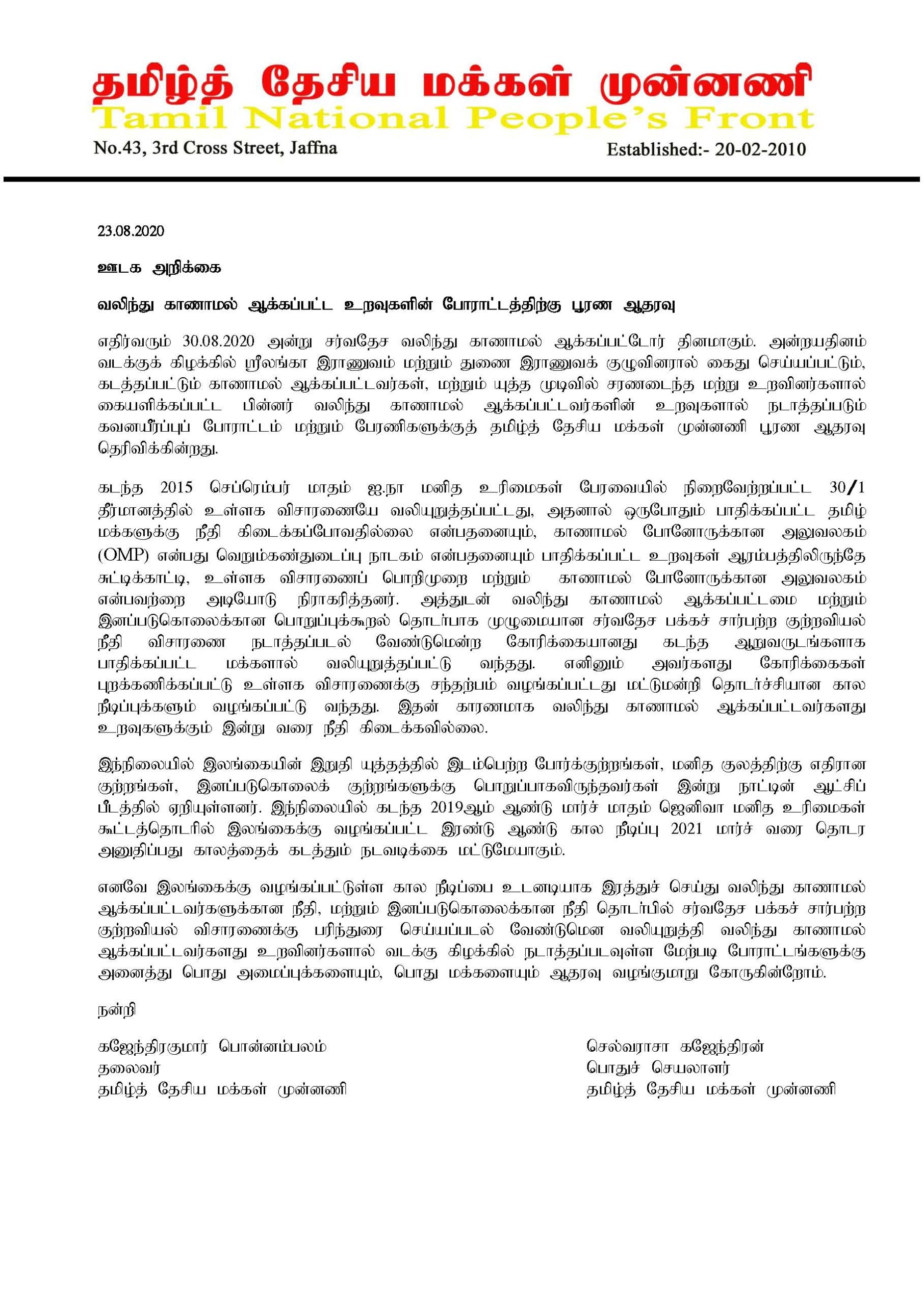 எதிர்வரும் 30.08.2020 அன்று சர்வதேச வலிந்து காணாமல் ஆக்கப்பட்டோர் தினமாகும். அன்றயதினம் வடக்குக் கிழக்கில் ஸ்ரீலங்கா இராணுவம் மற்றும் துணை இராணுவக் குழுவினரால் கைது செய்யப்பட்டும், கடத்தப்பட்டும் காணாமல் ஆக்கப்பட்டவர்கள், மற்றும் யுத்த முடிவில் சரணடைந்த மற்று உறவினர்களால் கையளிக்கப்பட்ட பின்னர் வலிந்து காணாமல் ஆக்கப்பட்டவர்களின் உறவுகளால் நடாத்தப்படும் கவனயீர்ப்புப் போராட்டம் மற்றும் பேரணிகளுக்குத் தமிழ்த் தேசிய மக்கள் முன்னணி பூரண ஆதரவு தெரிவிக்கின்றது.