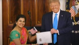 அமெரிக்காவின் வெள்ளை மாளிகையில் நடைபெற்ற நிகழ்ச்சியில் இந்திய பெண்ணுக்கு அமெரிக்க குடியுரிமையை டிரம்ப் வழங்கினார்.