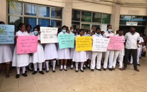 ஆர்ப்பாட்டத்தில் ஈடுபட்டவர்கள் அரச சட்டங்கள் அனைவருக்கும் சமன், எமக்கு மட்டும் ஏன் இந்த அநீதி, மன அமைதியுடன் பணிசெய்ய விடு போன்ற வாசகங்கள் எழுதிய பதாதைகளை ஏந்தியிருந்தனர்.