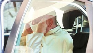 கூட்டு பிரார்த்தனை நடத்த வந்தபோது போப் ஆண்டவர் பிரான்சிஸ் முதல் முறையாக முக கவசம் அணிந்து வந்தார்.