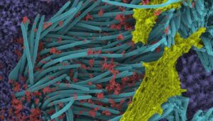 மைக்ராஸ்கோப் கருவி கொண்டு பெரிதாக்கி காட்டப்பட்டுள்ள செல் படங்கள், மனிதர்களின் சுவாச மேற்பரப்பில் ஏராளமான நுண்ணிய துகள்களை காட்டுகின்றன. அவை தொற்றை பிற திசுக்களுக்கும், மற்ற மனிதர்களுக்கும் பரப்ப தயார் நிலையில் உள்ளன.