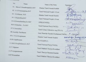 யாழ்ப்பாணத்தில் இன்று பகல் இதற்கான கடிதத்தில் தமிழ்த் தேசியக் கட்சிகளின் சார்பில் 14 முக்கியஸ்த்தர்கள் கையொப்பமிட்டனர்.