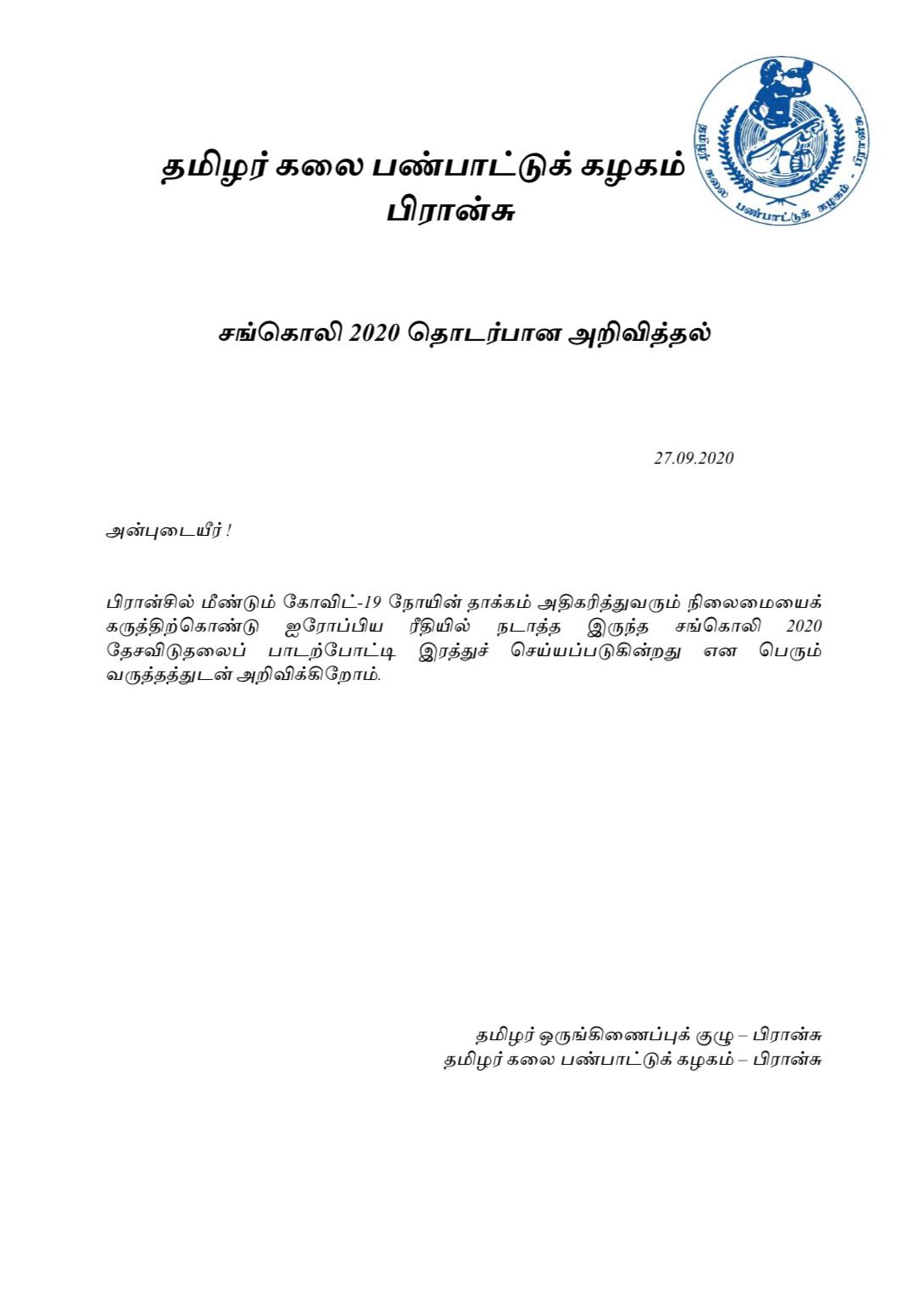 பிரான்சில் மீண்டும் கோவிட் 19 தொற்று அதிகரித்துள்ளமையின் காரணமாக “சங்கொலி 2020” தேசவிடுதலைப் பாடல் போட்டி இரத்துச் செய்யப்படுவதாக பிரான்சு தமிழர் ஒருங்கிணைப்புக் குழு – தமிழர் கலை பண்பாட்டுக் கழகத்தினால் வருத்தத்துடன் அறிவிக்கப்பட்டுள்ளது.