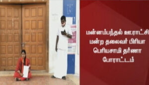 மன்னம்பந்தல் ஊராட்சி மன்ற தலைவர் பிரியா பெரியசாமி மயிலாடுதுறை ஊராட்சி ஒன்றிய அலுவலக வாயிலில் அமர்ந்து தர்ணா போராட்டத்தில் ஈடுபட்டுள்ளார்.