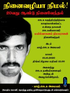 சுட்டுக்கொலை செய்யப்பட்ட ஊடகவியலாளர் மயில்வாகனம் நிமலராஜனின் 20 ஆவது நினைவு தின நிகழ்வுகள் யாழ். ஊடக மையத்தின் ஏற்பாட்டில் இன்று (19 ) நடைபெறவுள்ளன.