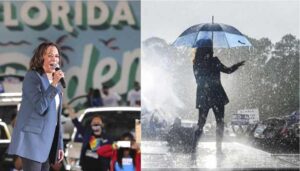 கமலா ஹாரிஸ் குடையை பிடித்துக் கொண்டு தனது பிரசாரத்தை தொடர்ந்தார். அப்போது அவர் தனது ஆதரவாளர்களை உற்சாகப்படுத்தும் விதமாக குடையை பிடித்தபடியே மழையில் நடனமாடினார்.