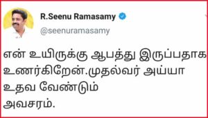 இந்நிலையில் இன்று காலை சீனு ராமசாமி டுவிட்டர் பக்கத்தில், என் உயிருக்கு ஆபத்து இருப்பதாக உணர்கிறேன். முதல்வர் அய்யா உதவ வேண்டும் அவசரம் என பதிவிட்டுள்ளார்.