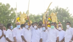 மருதுபாண்டியர்கள் சிலைக்கு மரியாதை செலுத்திய முதலமைச்சர், துணை முதலமைச்சருக்கு வீரவாள் பரிசாக அளிக்கப்பட்டது.