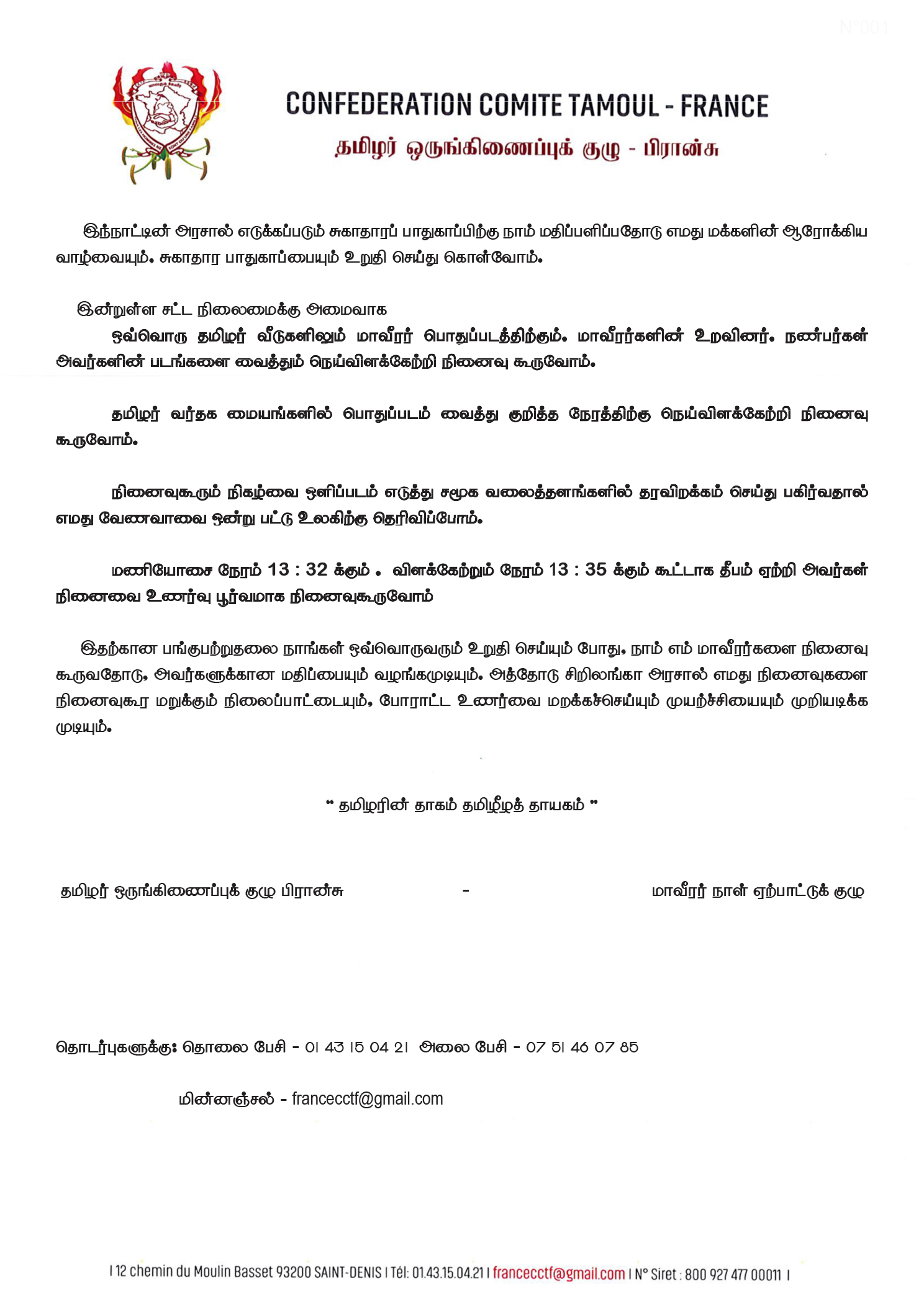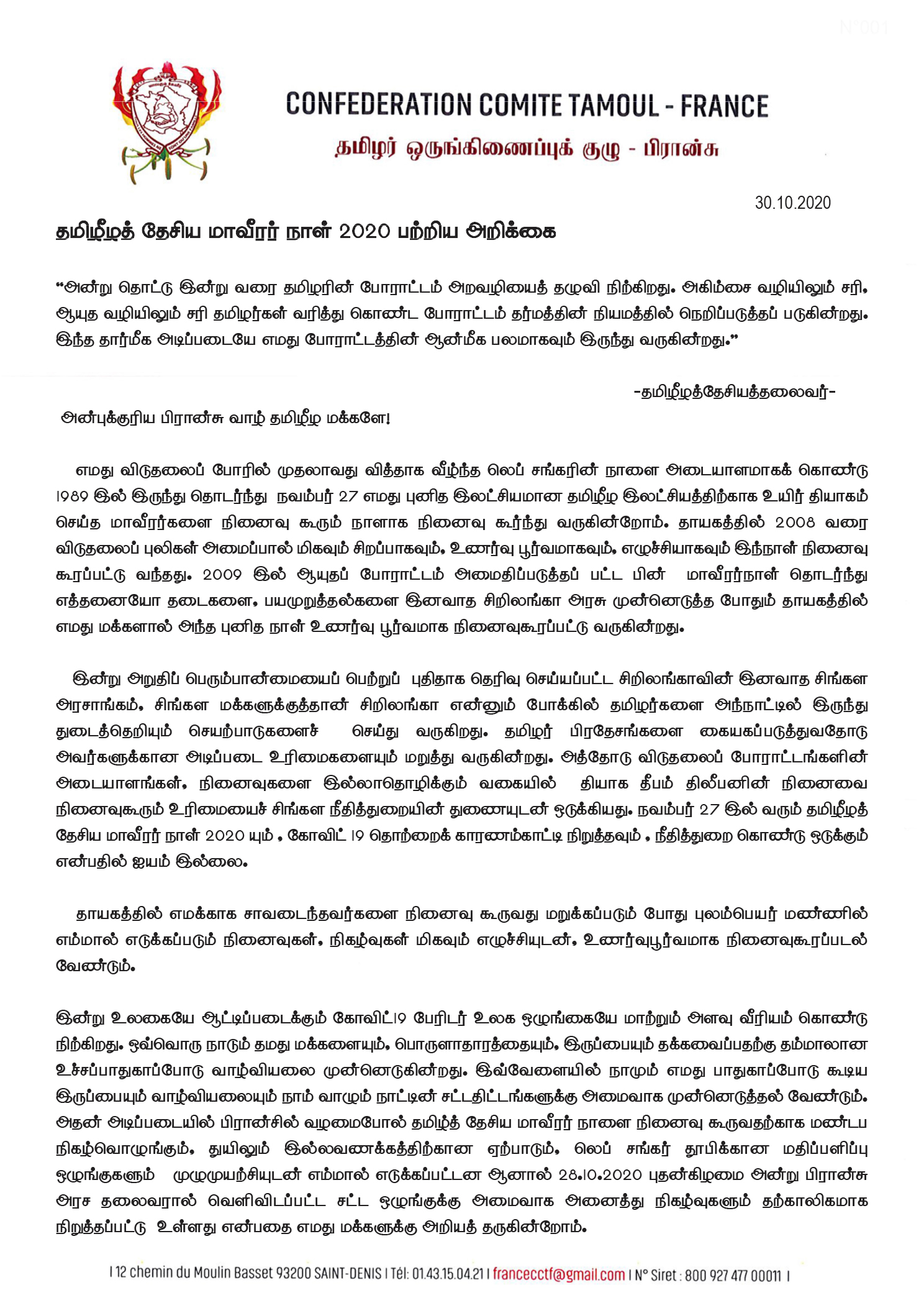 - மாவீரர் நாள் 2020 பற்றி தமிழர் ஒருங்கிணைப்புக் குழு பிரான்சினால் இன்று அறிக்கை வெளியிடப்பட்டுள்ளது