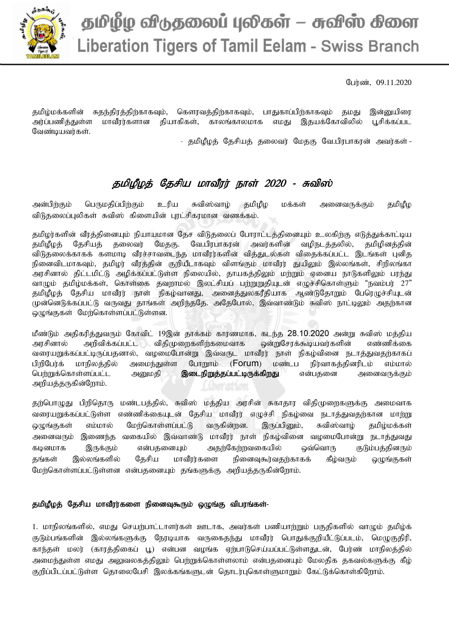 மீண்டும் அதிகரித்துவரும் கோவிட் 19இன் தாக்கம் காரணமாக, கடந்த 28.10.2020 அன்று சுவிஸ் மத்திய அரசினால் அறிவிக்கப்பட்ட விதிமுறைகளிற்கமைவாக ஒன்றுசேரக்கூடியவர்களின் எண்ணிக்கை வரையறுக்கப்பட்டிருப்பதனால், வழமைபோன்று இவ்வருட மாவீரர் நாள் நிகழ்வினை நடாத்துவதற்காகப் பிறிபேர்க் மாநிலத்தில் அமைந்துள்ள போறூம் (குழசரஅ) மண்டப நிர்வாகத்தினரிடம் எம்மால் பெற்றுக்கொள்ளப்பட்ட அனுமதி இடைநிறுத்தப்பட்டிருக்கிறது என்பதனை அனைவருக்கும் அறியத்தருகின்றோம்.
