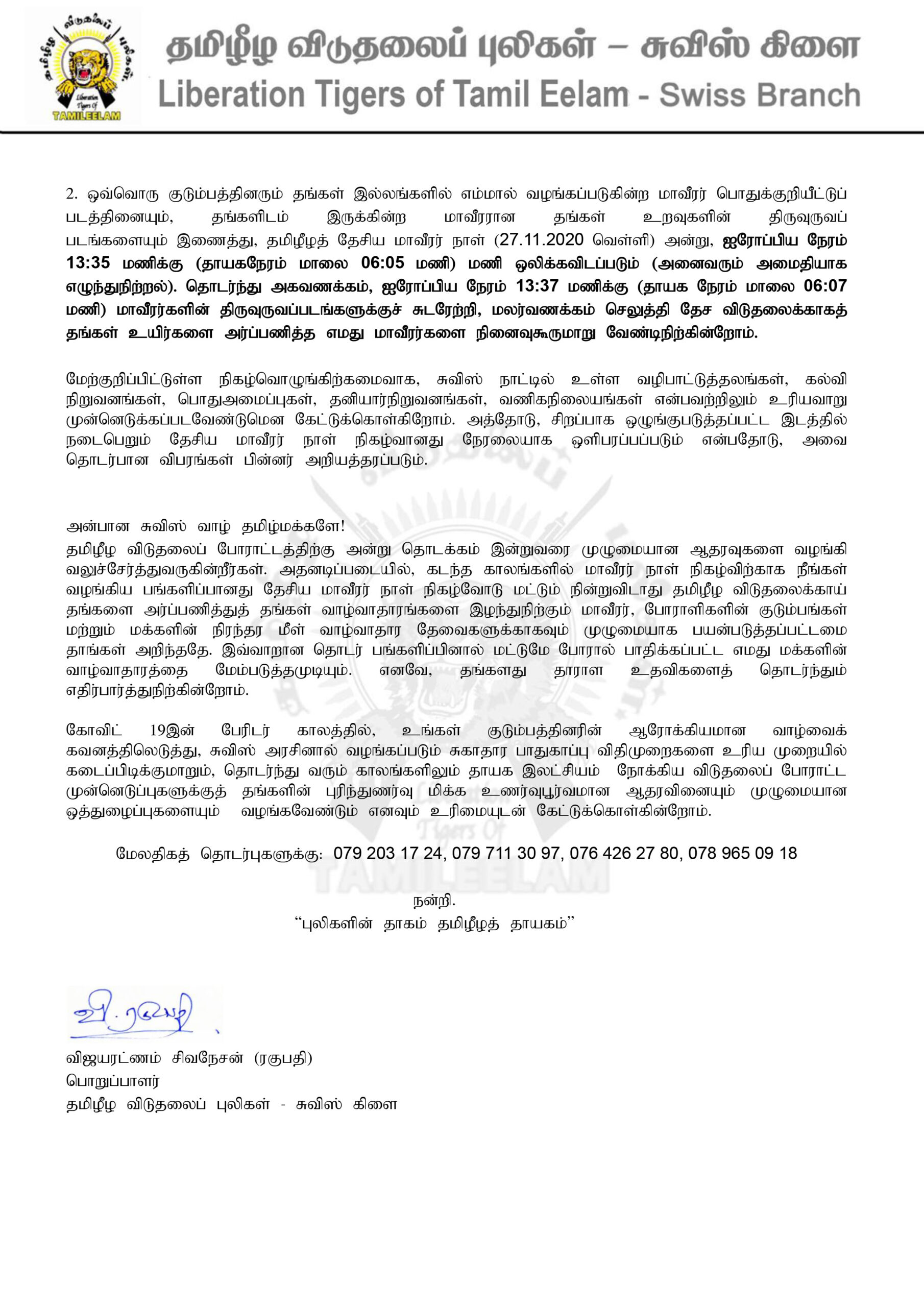 கோவிட் 19இன் பேரிடர் காலத்தில், உங்கள் குடும்பத்தினரின் ஆரோக்கியமான வாழ்வைக் கவனத்திலெடுத்து, சுவிஸ் அரசினால் வழங்கப்படும் சுகாதார பாதுகாப்பு விதிமுறைகளை உரிய முறையில் கடைப்பிடிக்குமாறும், தொடர்ந்து வரும் காலங்களிலும்; தாயக இலட்;சியம் நோக்கிய விடுதலைப் போராட்ட முன்னெடுப்புகளுக்குத் தங்களின் புரிந்துணர்வு மிக்க உணர்வுபூர்வமான ஆதரவினையும்; முழுமையான ஒத்துழைப்புகளையும் வழங்கவேண்டும் எனவும் உரிமையுடன் கேட்டுக்கொள்கின்றோம்.